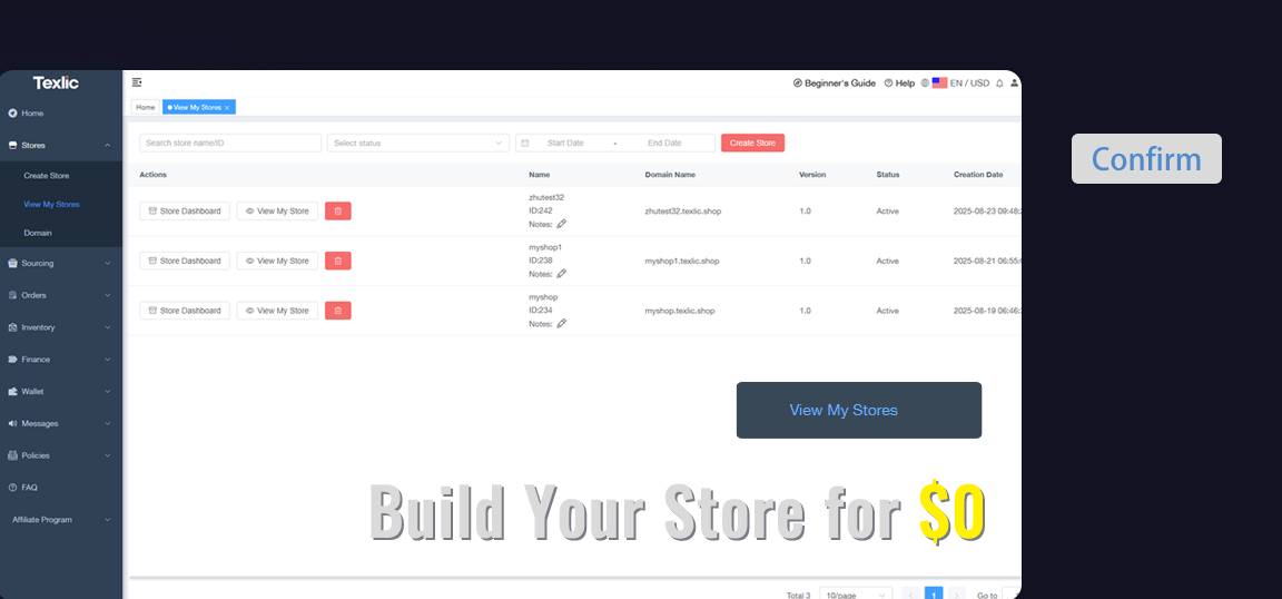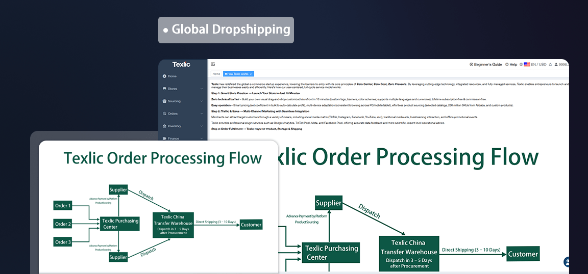 Answer: Texlic is a next-generation fully free e-commerce SaaS system with no subscription fees or service fees. You don't even need to pay for goods or shipping fees. Texlic supports global small and medium-sized sellers by offering interest-free advance payment for goods and shipping costs. You only need to use our intelligent system to build your store, promote it, and drive traffic to generate orders. All other costs are paid in advance by Texlic. After the order is delivered, Texlic's financial system will automatically deduct the advanced payments for goods and shipping, then settle the profits for you and transfer them to your account.